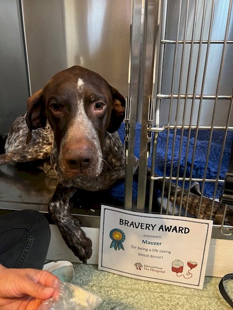 Did you know that pets require blood transfusions just like humans? In cases such as severe trauma, snake bite, or extensive surgeries like splenectomies, we may be required to give a blood transfusion. Mauzer the German short-haired pointer recently donated blood for our clinic! Donated blood can be frozen and kept on-hand for emergencies for up to a month.